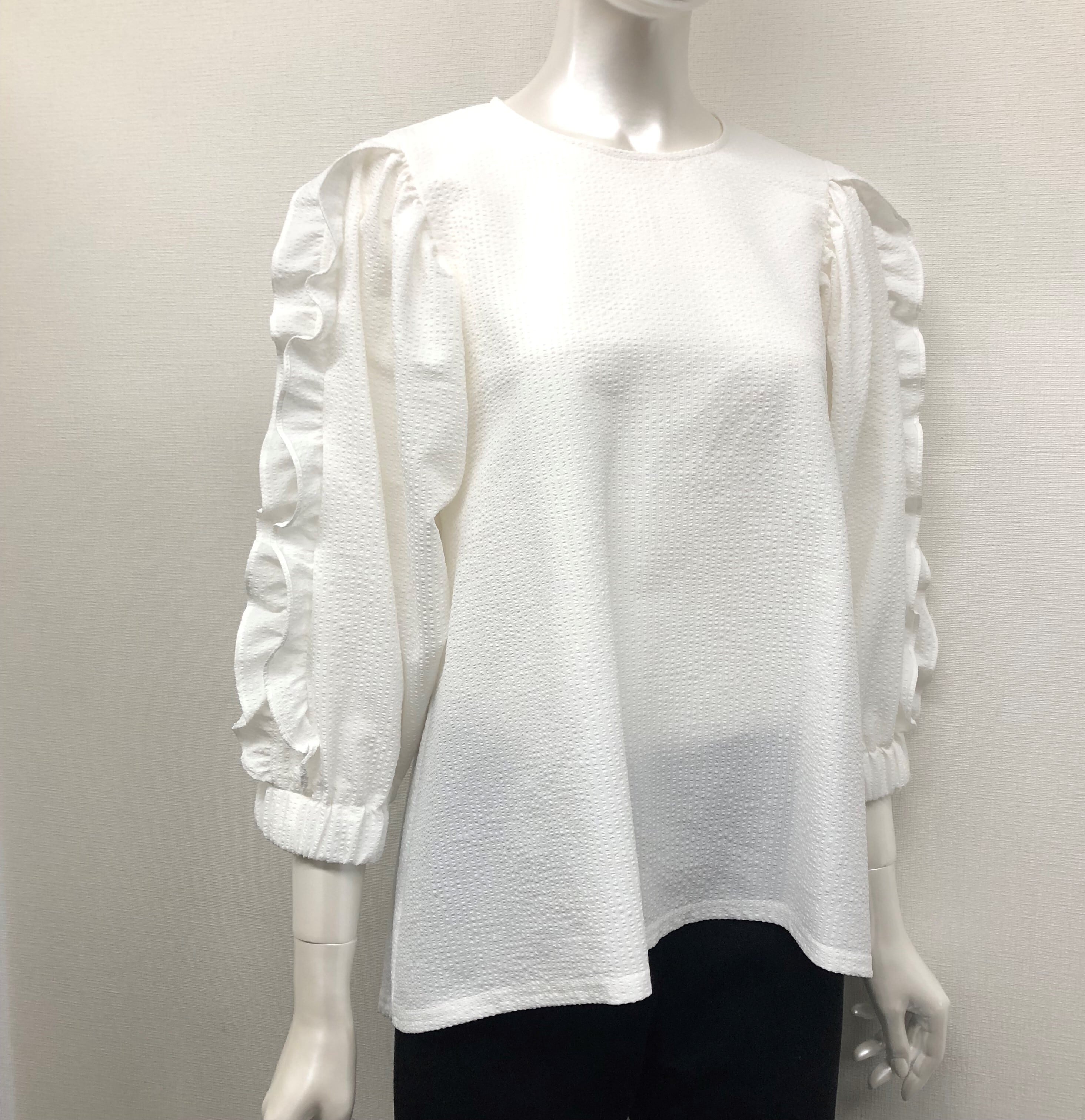 2wayストレッチのサッカー素材を使用した着心地の良いブラウス。袖のフリルが可愛らしさをプラスし、女性らしいシルエットを演出します。